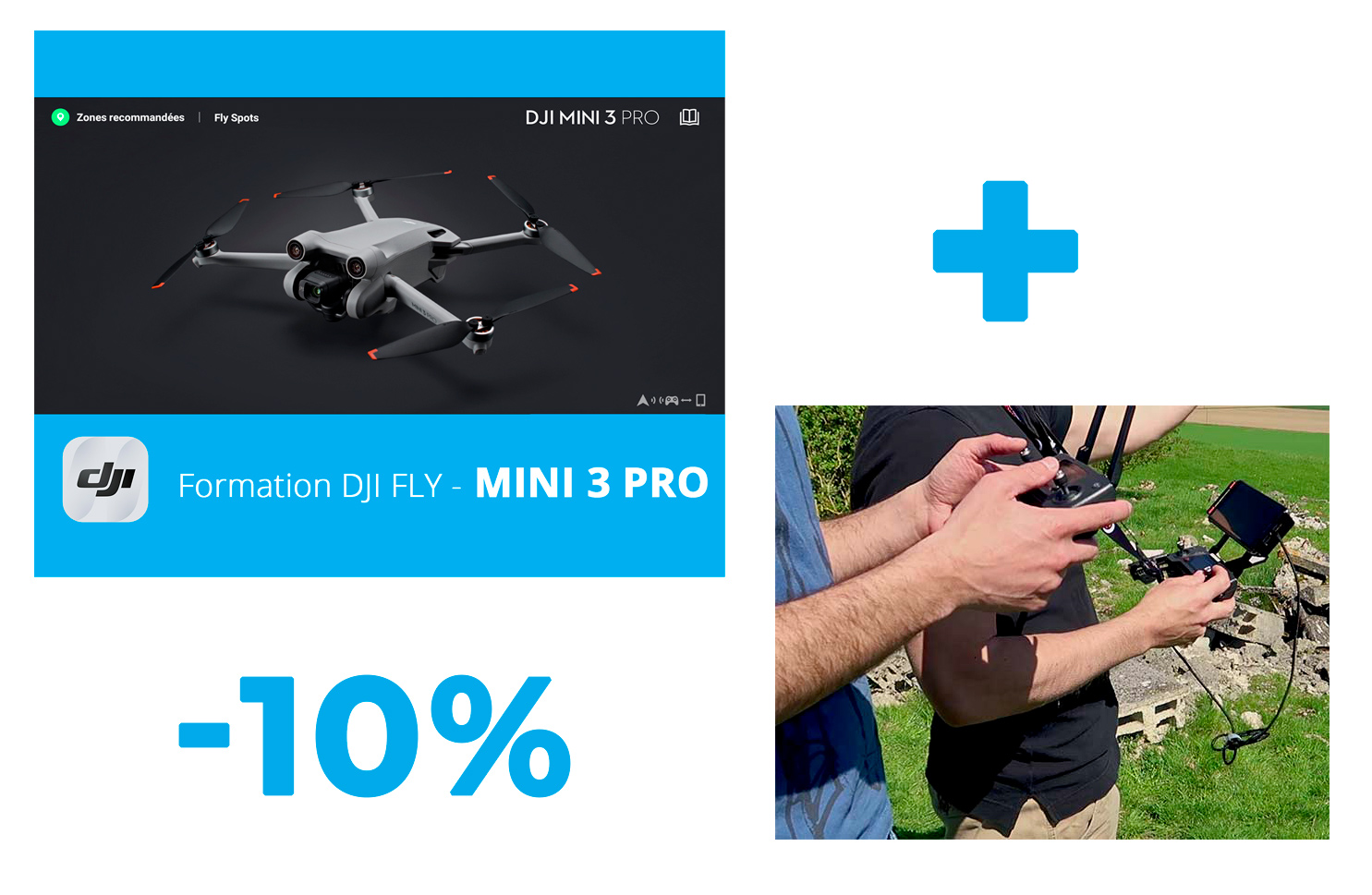 Bénéficiez d'une remise de 10 % pour l'achat d'un pack formation drone qui comprend une formation sur l'application DJI FLY plus la formation sur le PILOTAGE.